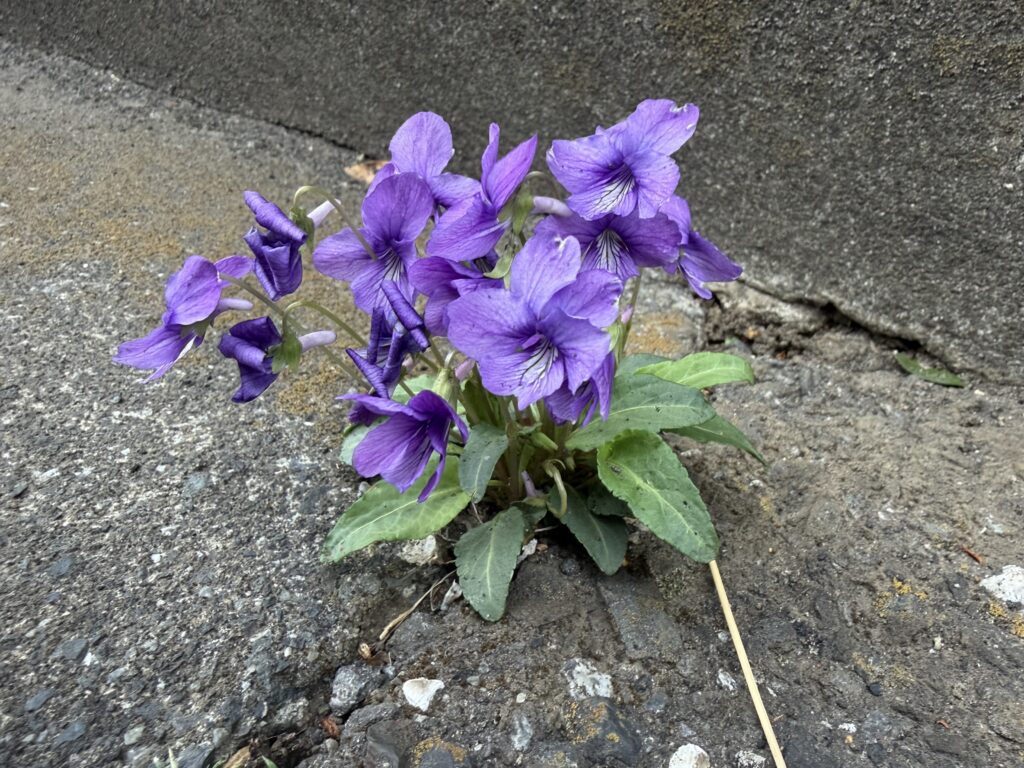 家から駅に向かう途中、舗装されたコンクリートの間にすみれが咲いています。
