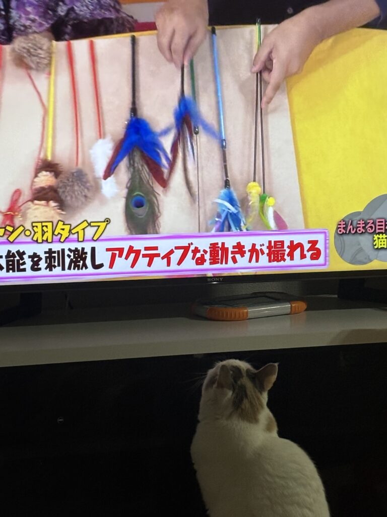 テレビで猫じゃらしの紹介をしていたので見ていると、家の猫も見に来ていました笑