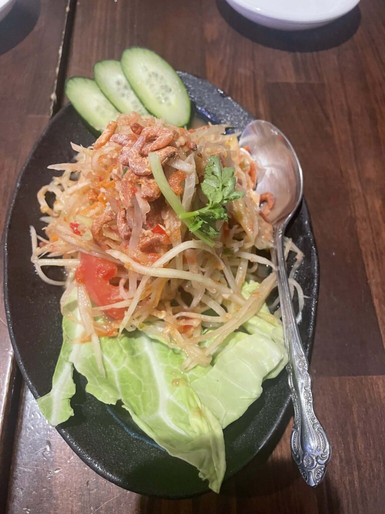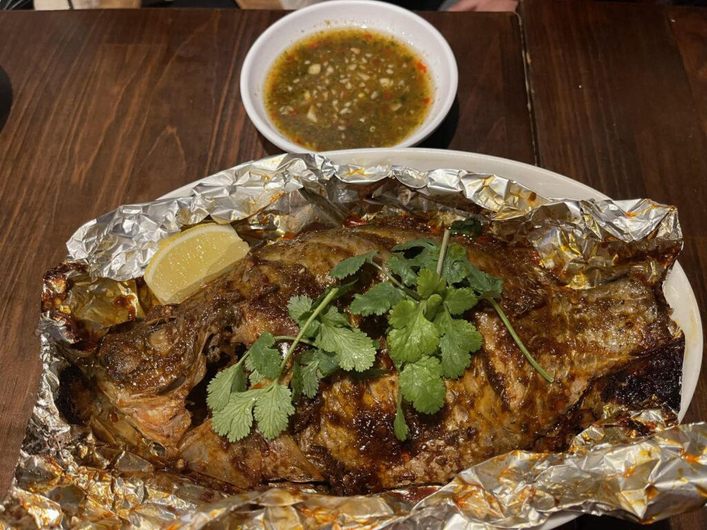 休みの日 友達とミャンマーの店へ行って焼き魚とパパヤサラダを食べました。辛くて美味しかったです!