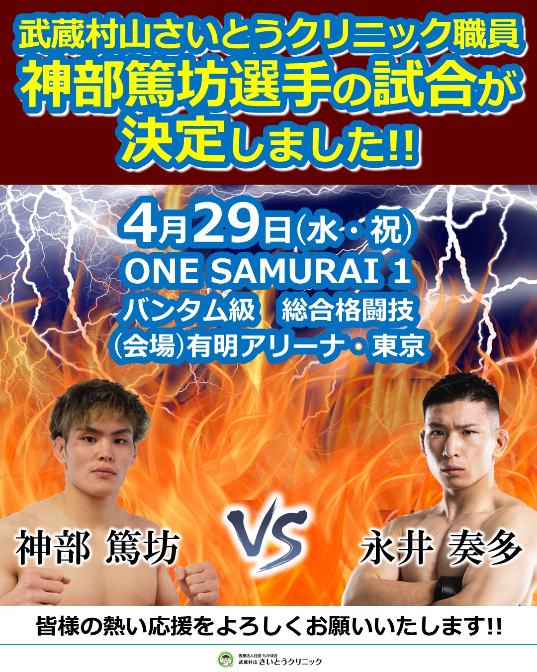 武蔵村山さいとうクリニック職員の神部篤坊選手の試合が決定いたしました!