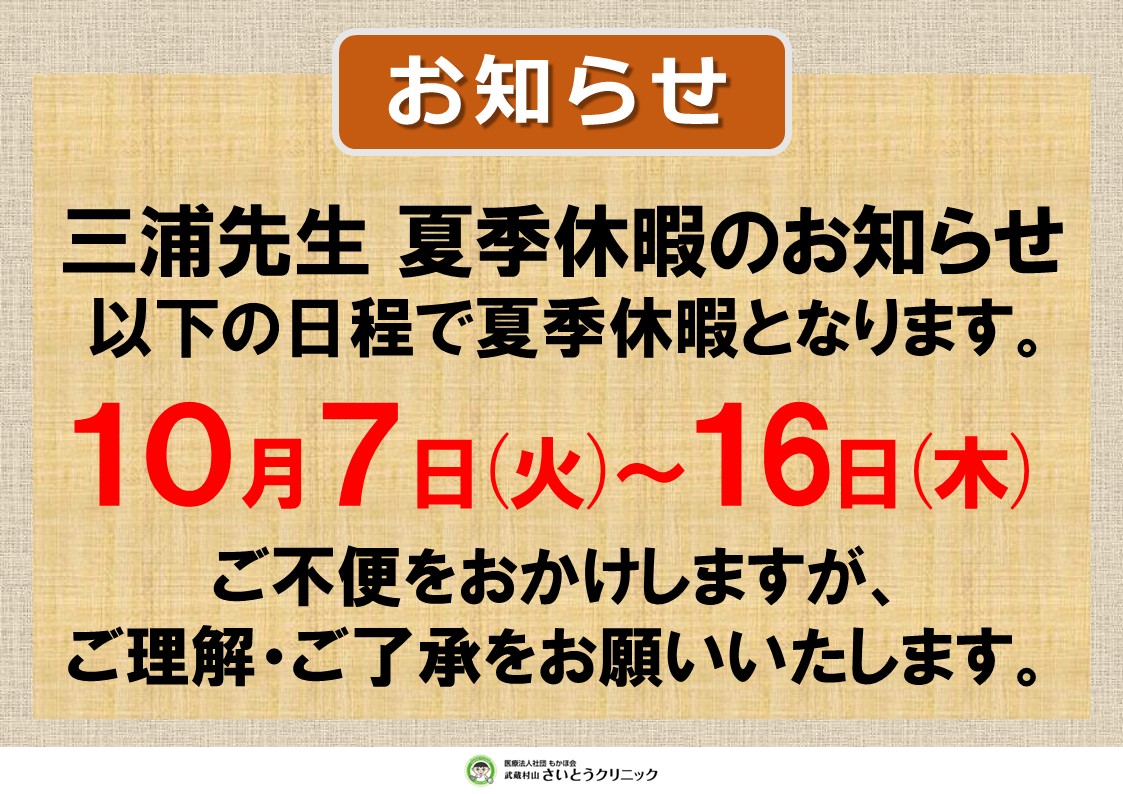 三浦先生夏季休暇(10/7~10/16)のお知らせ