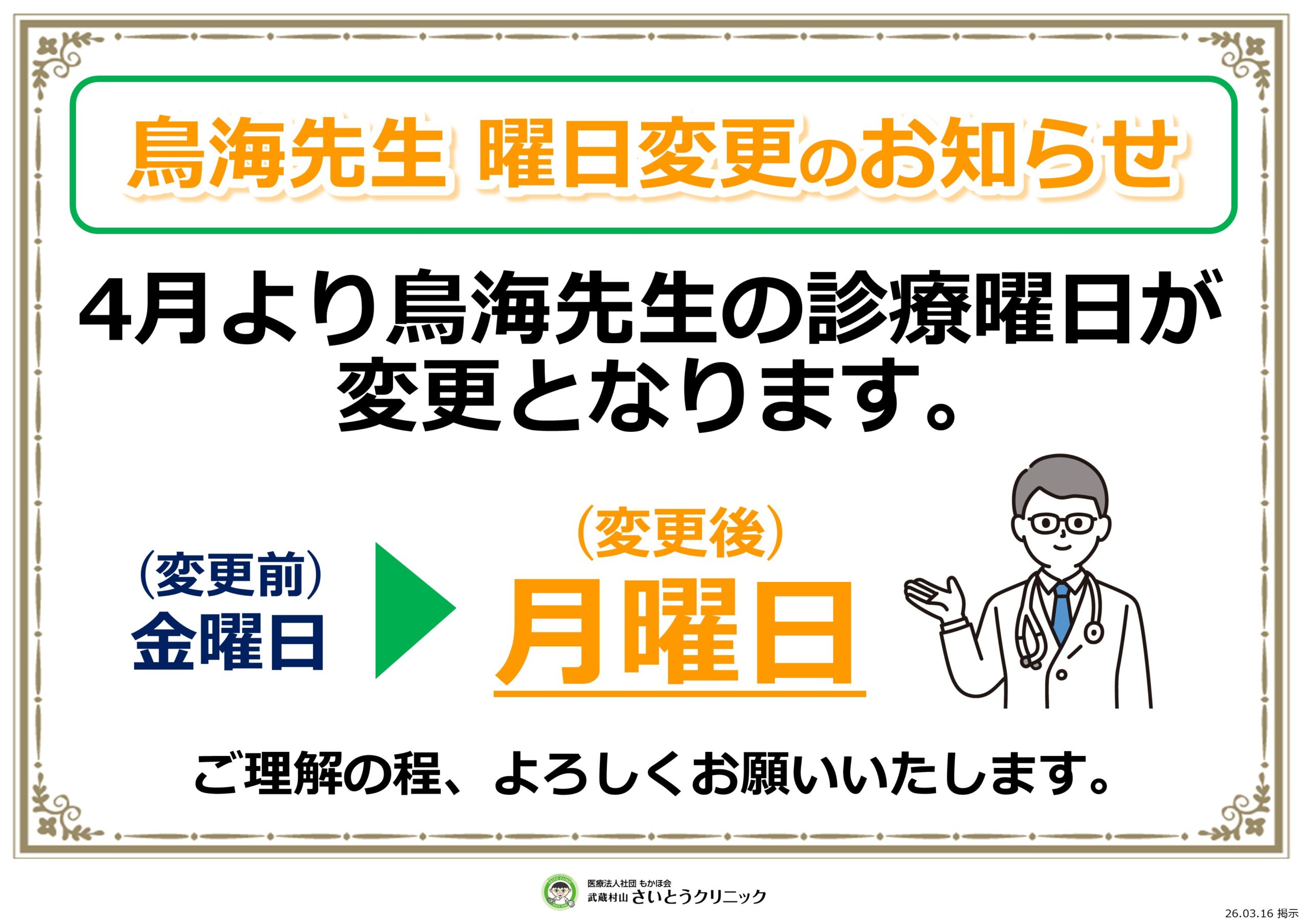 鳥海先生の診療曜日変更のお知らせ